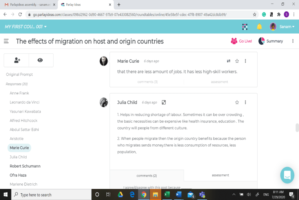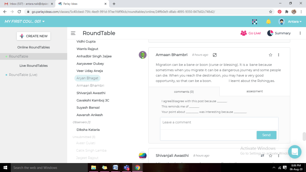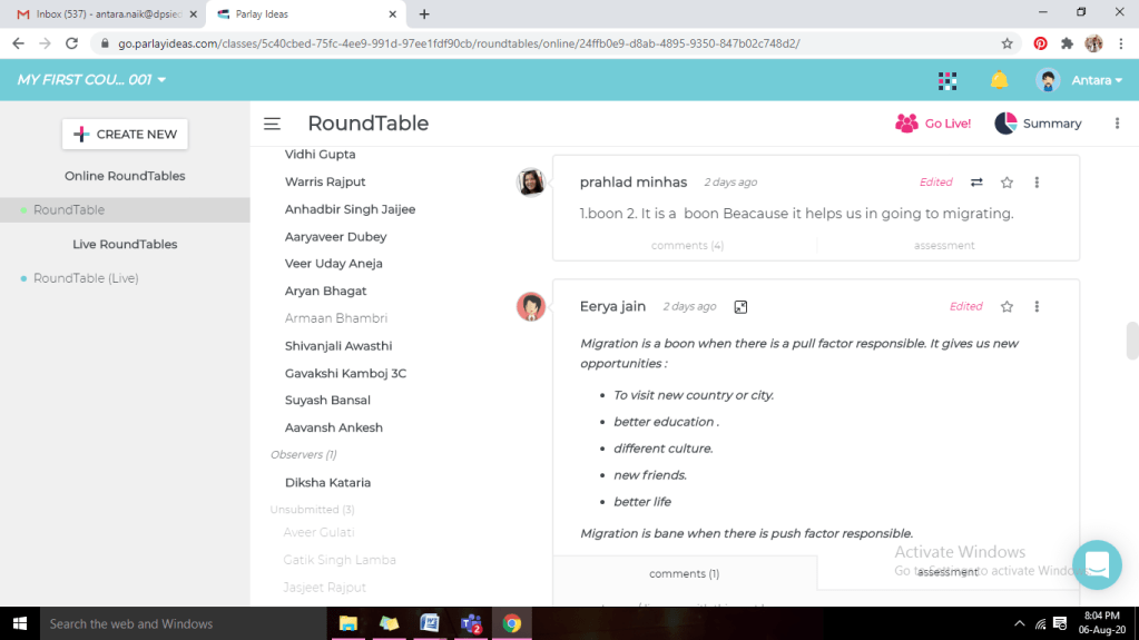 As I began to explore further, I realized the opportunities that a site like this could present to an online classroom. A teacher need only create an account with pale ideas to begin making what is known as a round table. This means that the educator can frame a topic or guiding question around which the students will submit their opinion. I prefer to use debatable questions when I use this website, such as ‘Migration-boon or bane’. Open-ended questions honestly give the learners opportunities to stretch their minds, reflect, and eventually justify their opinion with appropriate reasons.