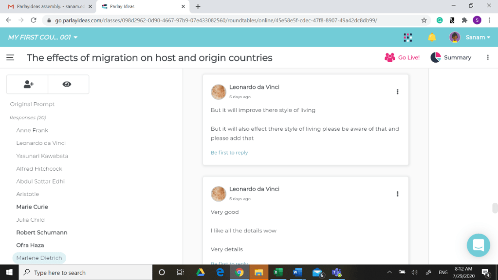 When the teacher finishes setting up the roundtable prompt, they only need to share the link for Parlay Ideas with the students. There is no need to set up an additional classroom in advance like some of the other tech tools on the internet, which is why I believe the ease of use of this tool is fantastic. Students then need to log in with an email ID and password of their own, and the website will immediately guide them to the teacher’s prompt. Bear in mind that learners should have enough time to think about the topic before they are required to pen down their thoughts.