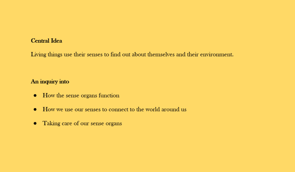 It dawned on me that I did not need to be anxious about planners and executing a unit perfectly, the power of student agency enabled me to give control of designing unit on ‘Senses’ to the learners. I was apprehensive at first and gave the students their Central Idea and Lines of Inquiry with trepidation.