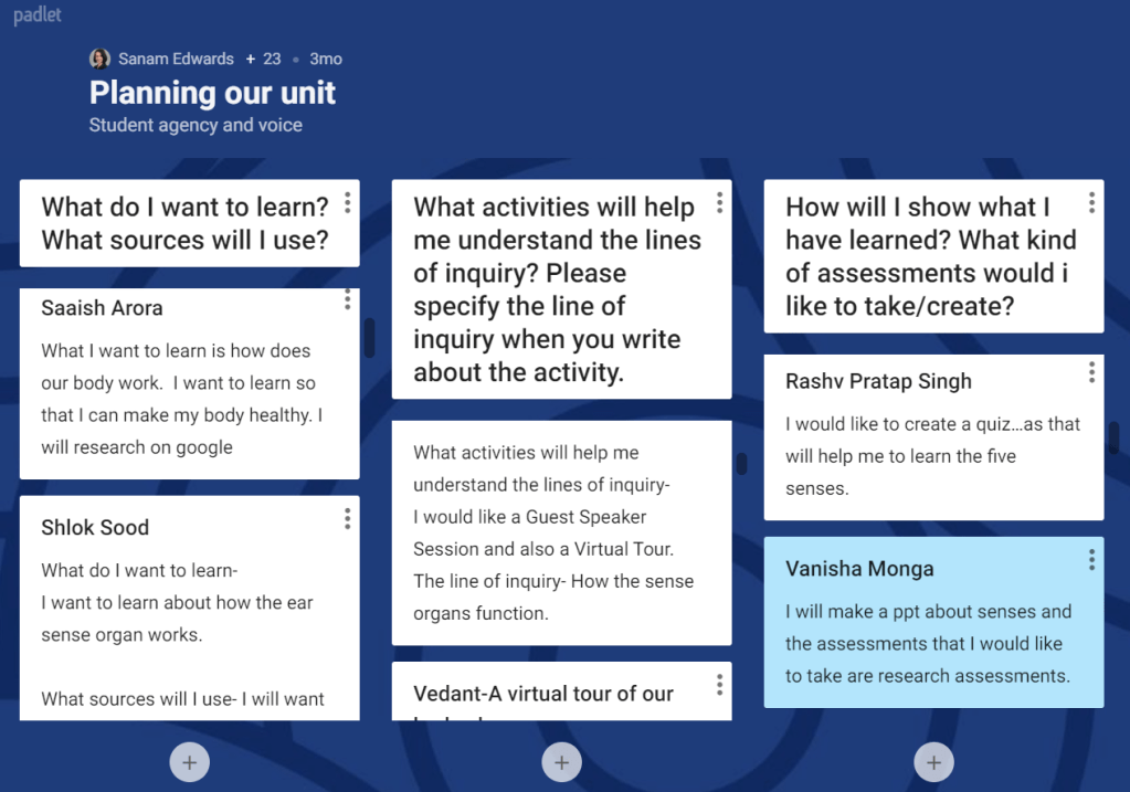 By essentially handing over command to the students, they had begun to grasp why they needed to dig deeper into the unit. They evaluated each line of inquiry and commenced bouncing questions off one another about what they needed to know, and why they required to know it. Instead of dragging their feet through teacher-planned activities, they came up with thoughts on how they would like to collect information. Every child was eager to give their suggestions on the Padlet link, and since they were suggesting activities that appealed to them, the responses catered to every learning style. The desired learning engagements ranged from research-driven tasks to experiments that would enhance their understanding of their senses and how they work in tandem.