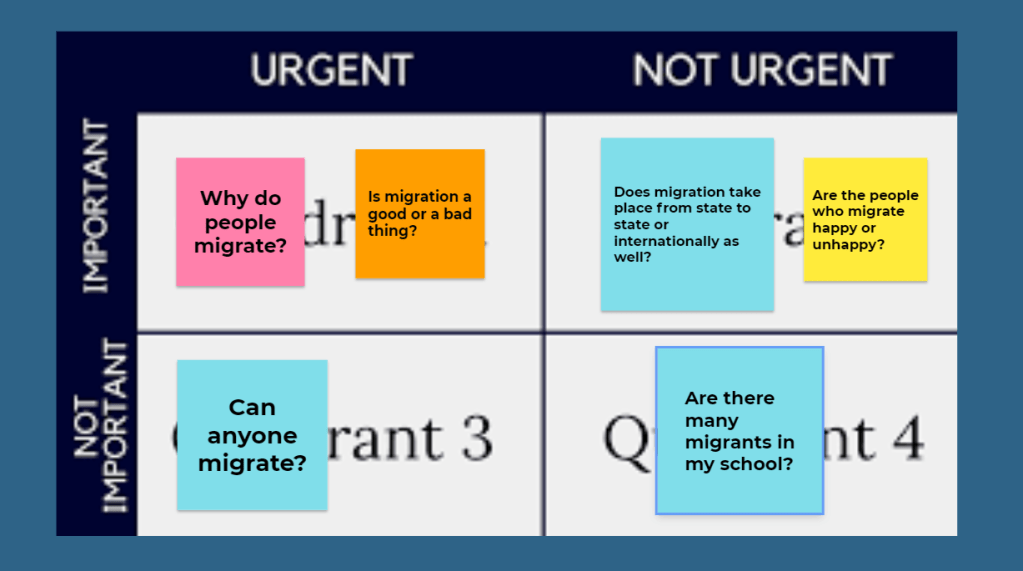 The students began to analyze the relevance and importance of each question and moved the questions to the appropriate zones. Some questions were relevant but did not require immediate attention. Others were both relevant and important and needed to be inquired into before branching out further into the topic of migration. As we went along, the Jamboard began to fill with questions that the students sorted into quadrants with no help from me. Collaboration played a key role as the learners had to agree on a quadrant before placing a question there.