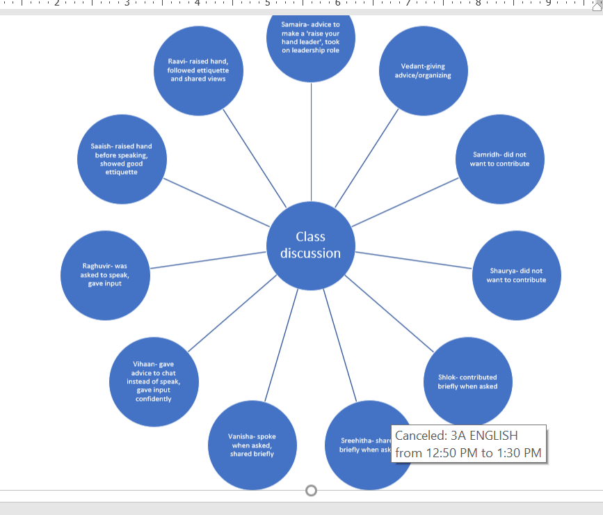 While the discussion took place, I began to create a spider- web of the inputs from the children, noting down the contributions from all, or lack thereof. Once the students wound up their independent discussion, I shared the spider web on the screen and asked the students to reflect on their class participation. The culmination of this activity lay in the fact that the children were shocked to see that their responses were being recorded without their knowledge. They realized that while online, their actions and words were visible to unknown quantities and recordings could be made without their permission. They pledged to make wise decisions online and follow the necessary etiquette to put their best foot forward while online.