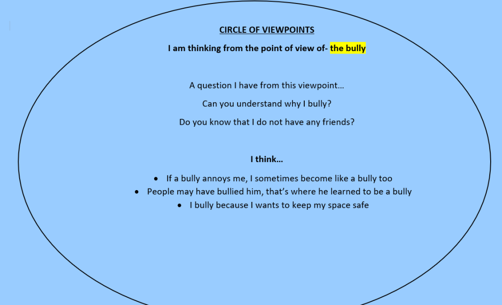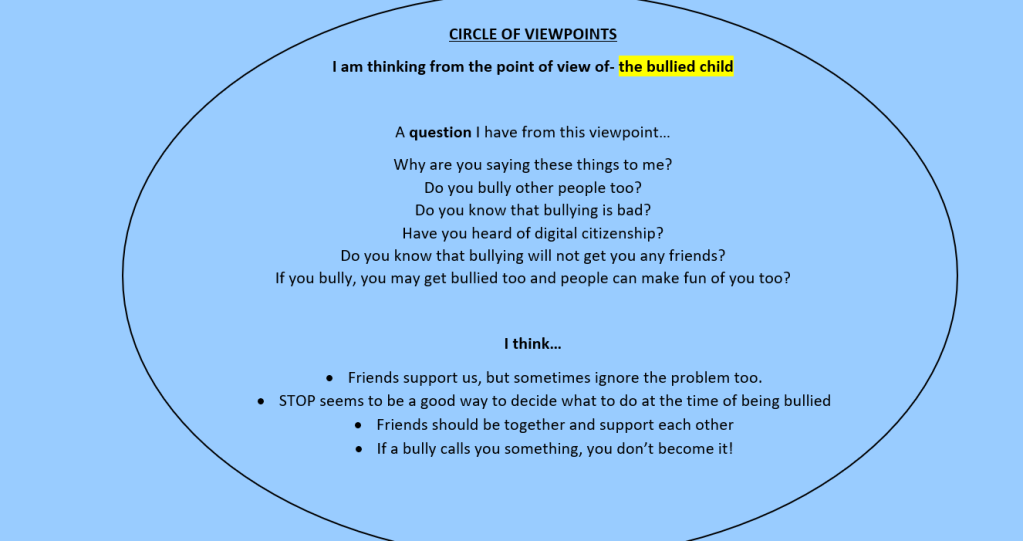 We then went on to use the ‘Circle of viewpoints’ VTR to analyze cyber-bullying, both from the perspective of the bullied child as well as the bully. Students came up with insightful questions from both perspectives and tried to understand the emotions of both parties. The students introspected on their own stories of being bullied or bullying someone and were able to identify the harsh effect that language has on everyone’s psyche when used inappropriately.