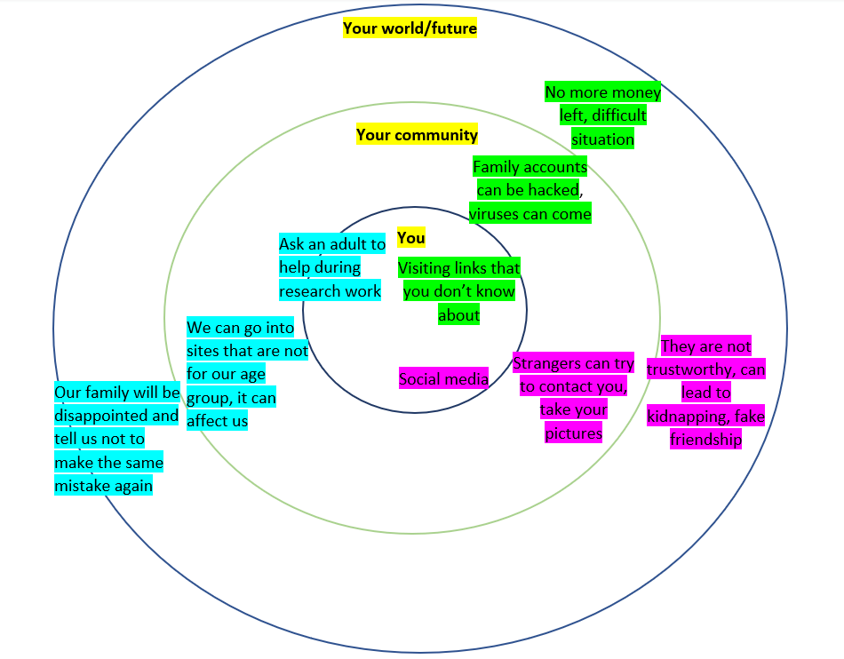 The students reviewed their daily online activities and determined how it could affect them, their families, and their future if not handled responsibly. For example, the students brainstormed on how posting private information online could enable strangers to hack into financial accounts. This situation would not only lead to the child suffering from guilt but would have huge repercussions on the family as well as their future. The facilitator took notes on a shared screen while the students spoke so that other students could identify with their peers and experiences. After an engaging discussion, students penned down their reflections and takeaways on a Padlet link.