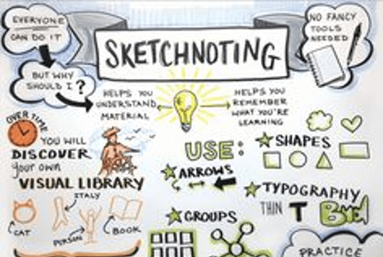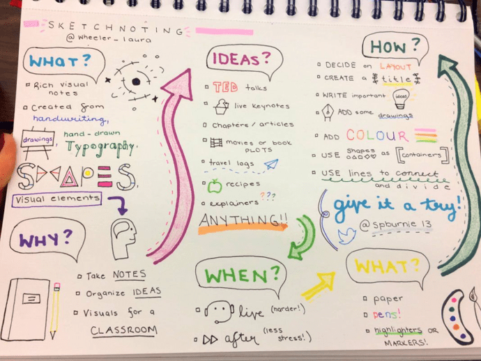 An artistic form of notetaking, sketch notes have taken the adult world by storm. There was a time when I would scroll through Twitter and spot two or more posts exhibiting magnificent sketch notes for professional development sessions or workshops. I found myself scrutinizing each arrow and stick figure, moving from one section to the next, in awe of the creator’s thought process. It struck me that I would never have taken a second glance at their effort had they shared traditional bullet points or lists. Instead, I speculated on what sorts of artwork the other attendees would have conceived and whether they would tell an entirely different story.