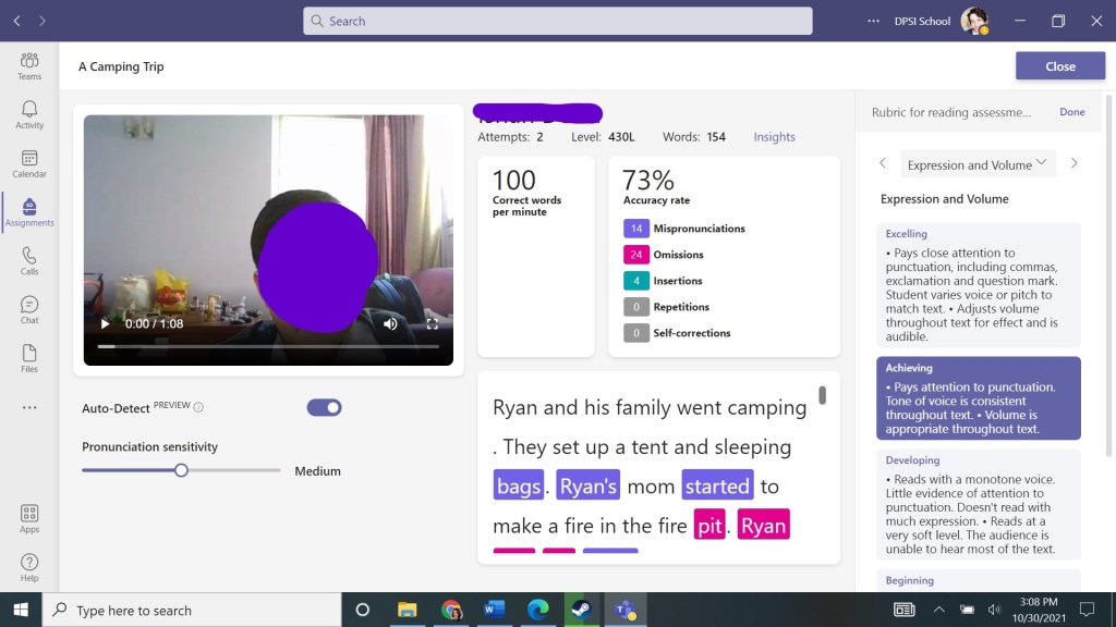 - Once this is done, students can head over to the assignments tab. Once they click on the reading progress assignment, they will be able to see themselves on camera along with a text.