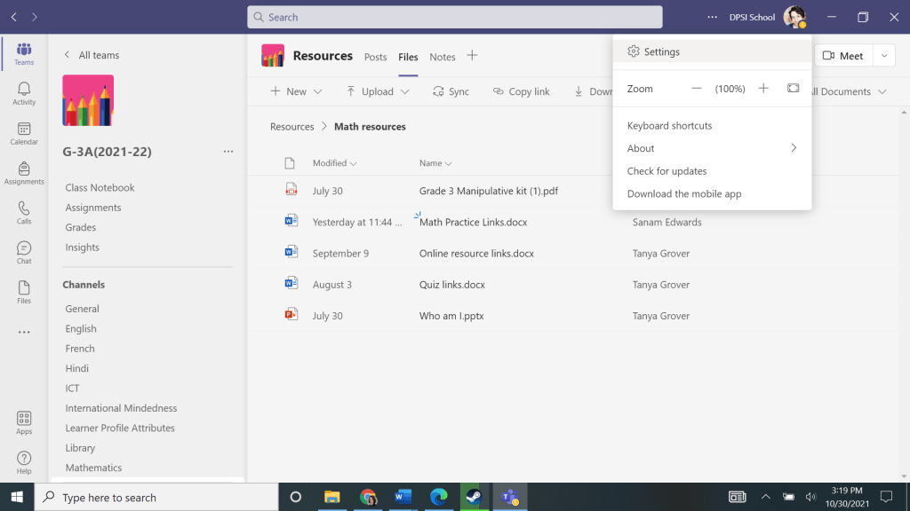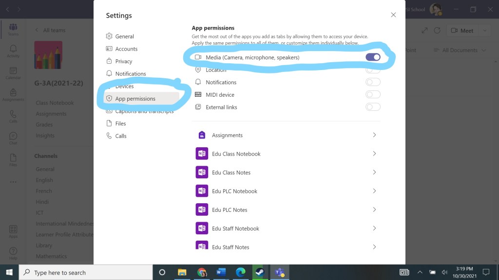 - On their main page on Teams, they will need to click on the three dots on the top right of their screen next to the profile picture. They will click on settings->app permissions->turn on media permissions.