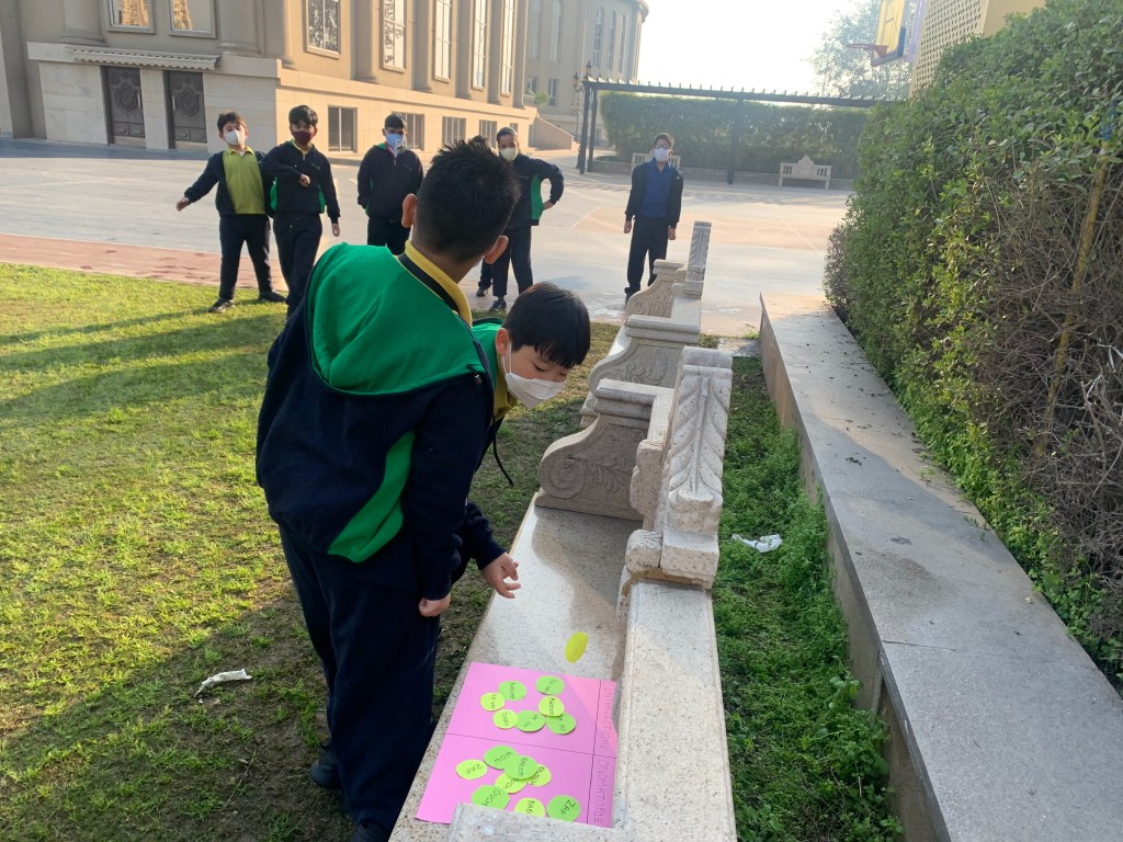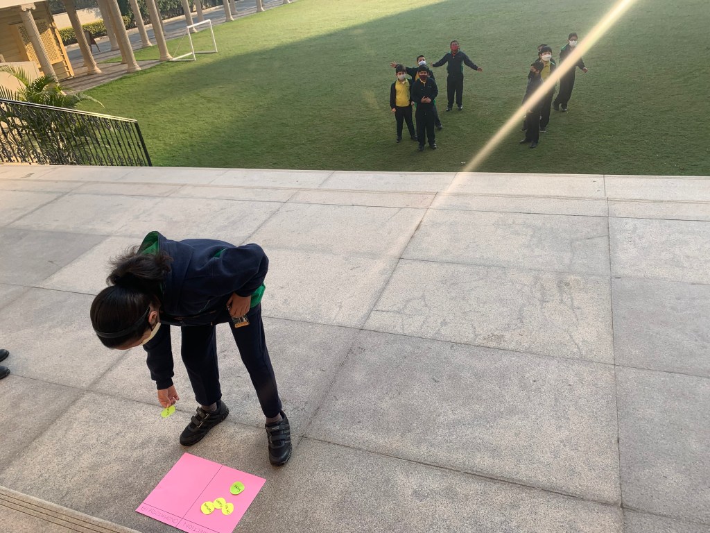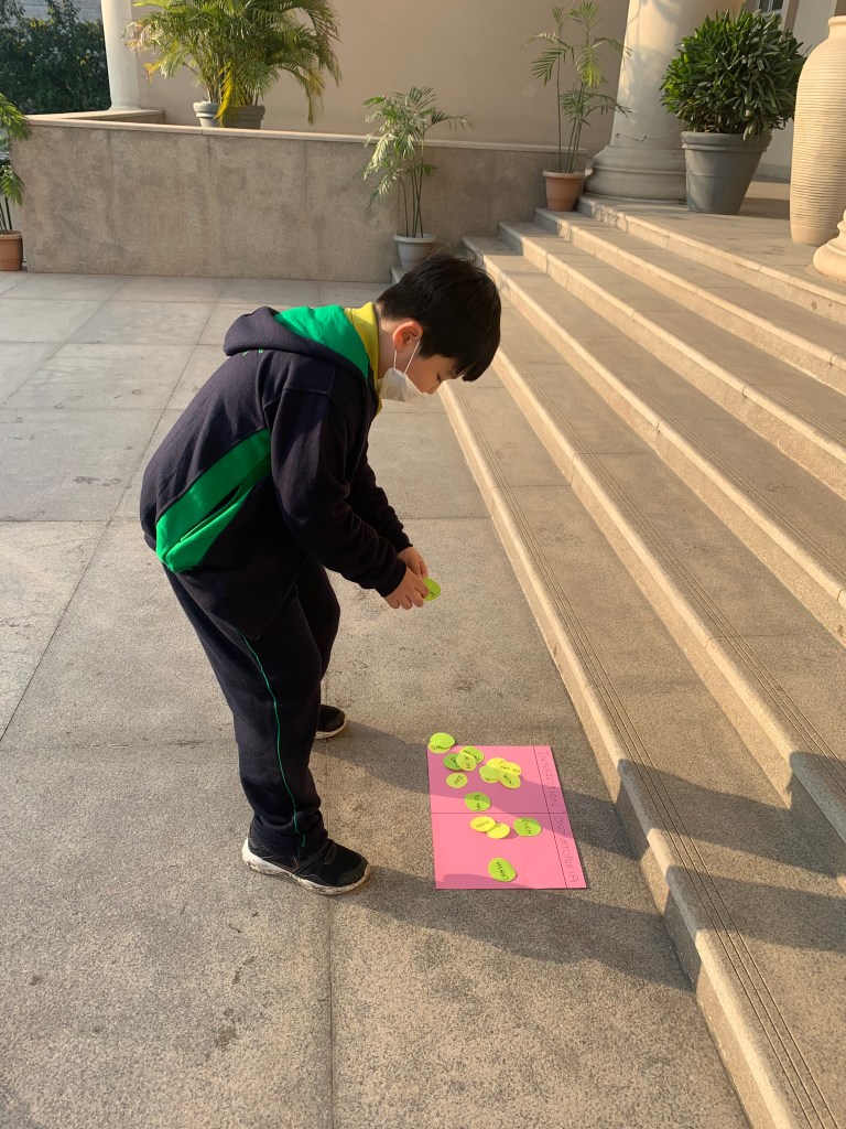 Secondly, I hid small cutouts with various onomatopoeia and interjections all over the school ground. There were cutouts for two teams, so I ensured that the circles were in two different colours.